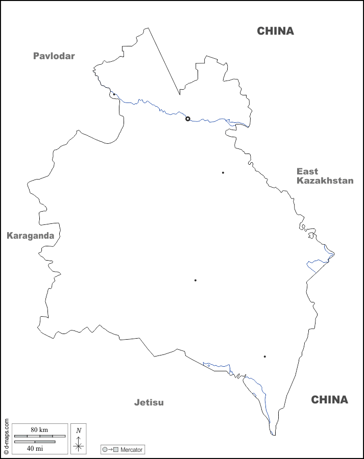 d-maps > Ásia > Cazaquistão > Região de Abai > contornos, hidrografia, principais cidades, branco