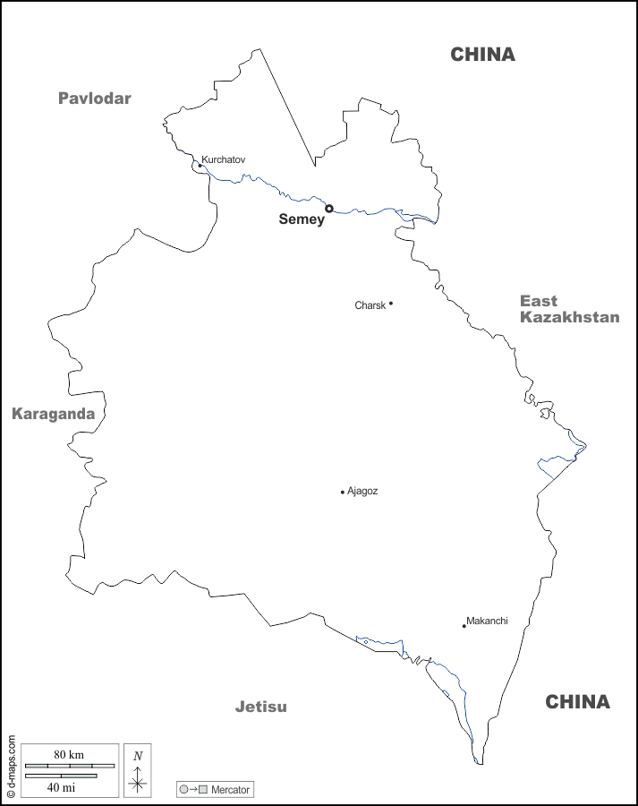 d-maps > Ásia > Cazaquistão > Região de Abai > contornos, hidrografia, principais cidades, nomes, branco
