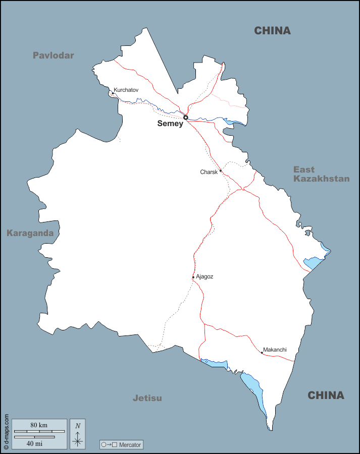 d-maps > Ásia > Cazaquistão > Região de Abai > contornos, hidrografia, principais cidades, estradas, nomes