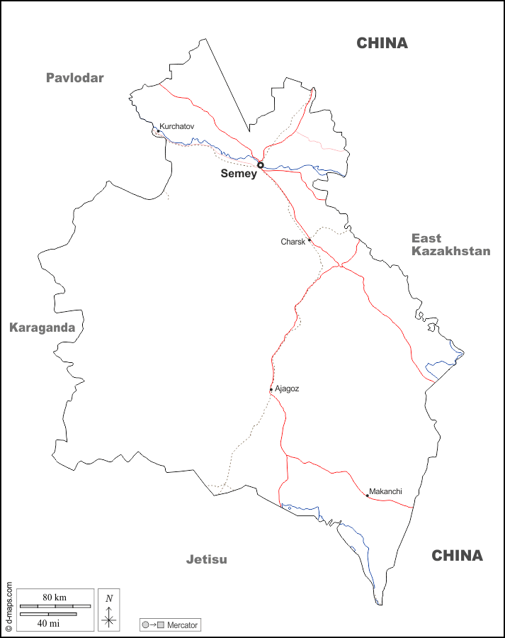 d-maps > Ásia > Cazaquistão > Região de Abai > contornos, hidrografia, principais cidades, estradas, nomes, branco