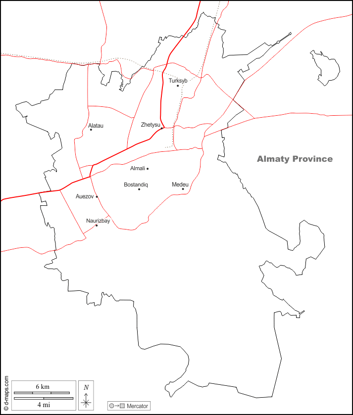 d-maps > Ásia > Cazaquistão > Almaty Cidade > fronteiras, principais cidades, estradas, nomes, branco