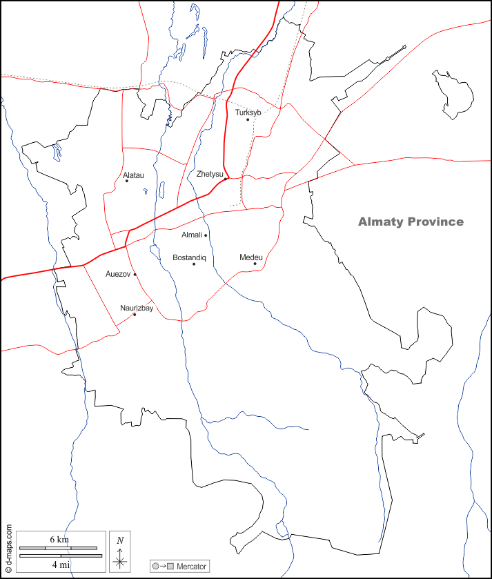d-maps > Ásia > Cazaquistão > Almaty Cidade > fronteiras, hidrografia, principais cidades, estradas, nomes, branco