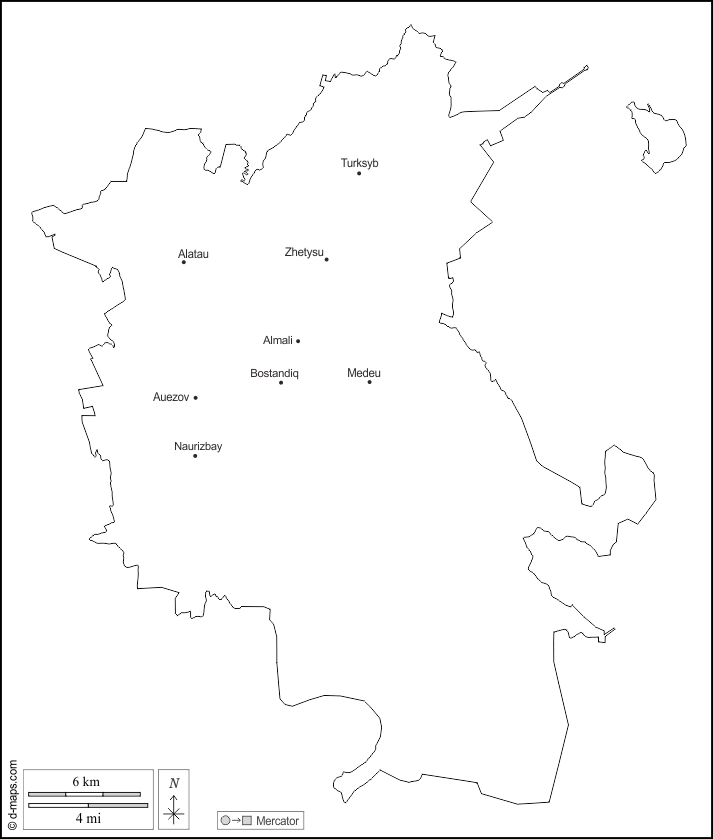 d-maps > Ásia > Cazaquistão > Almaty Cidade > contornos, principais cidades, nomes, branco