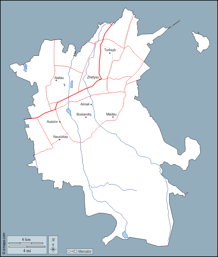 d-maps > Ásia > Cazaquistão > Almaty Cidade > contornos, hidrografia, principais cidades, estradas, nomes