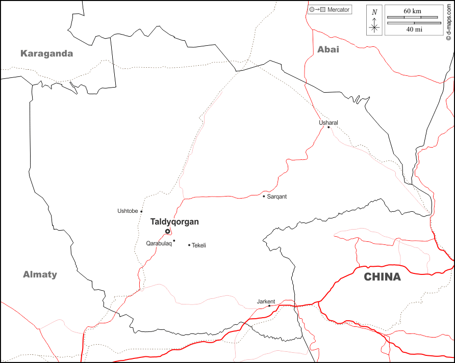 d-maps > Ásia > Cazaquistão > Região de Jetisu > fronteiras, principais cidades, estradas, nomes, branco