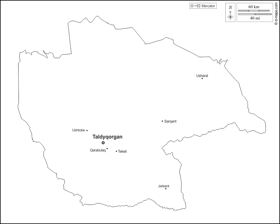 d-maps > Ásia > Cazaquistão > Região de Jetisu > contornos, principais cidades, nomes, branco