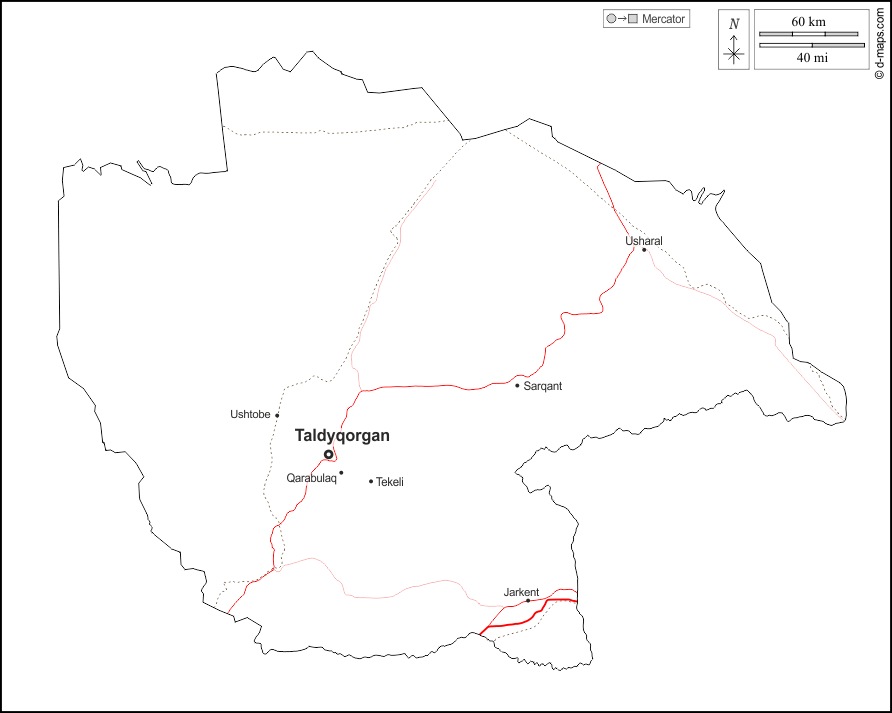 d-maps > Ásia > Cazaquistão > Região de Jetisu > contornos, principais cidades, estradas, nomes, branco