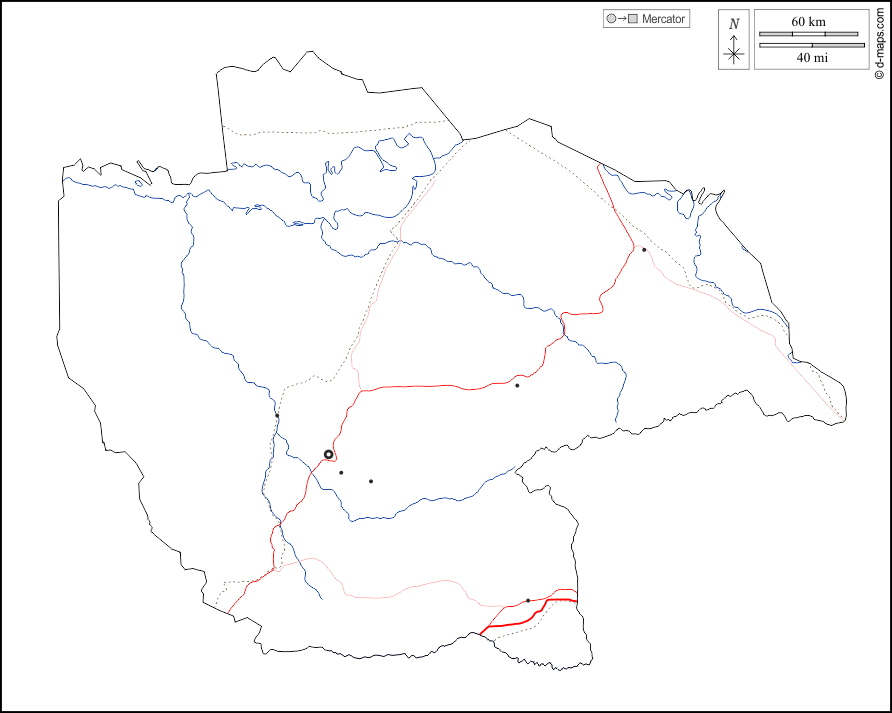 d-maps > Ásia > Cazaquistão > Região de Jetisu > contornos, hidrografia, principais cidades, estradas, branco