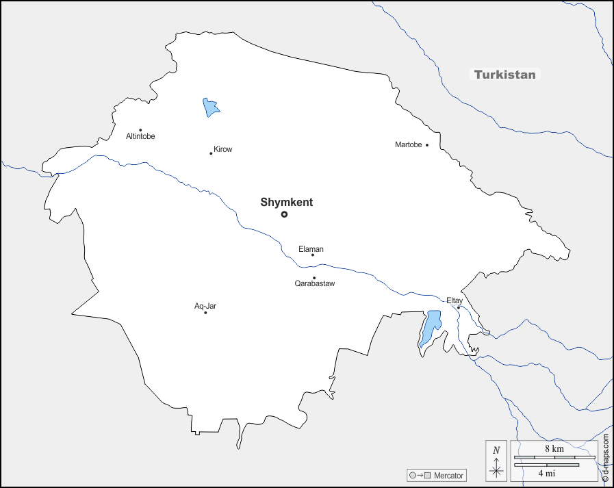 d-maps > Ásia > Cazaquistão > Shymkent > fronteiras, hidrografia, principais cidades, nomes