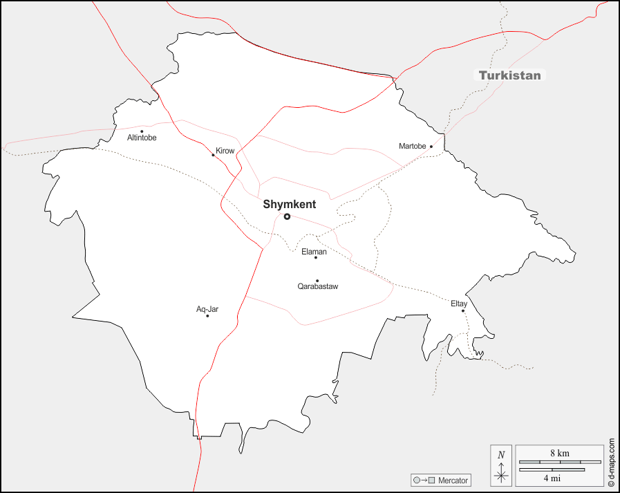 d-maps > Ásia > Cazaquistão > Shymkent > fronteiras, principais cidades, estradas, nomes