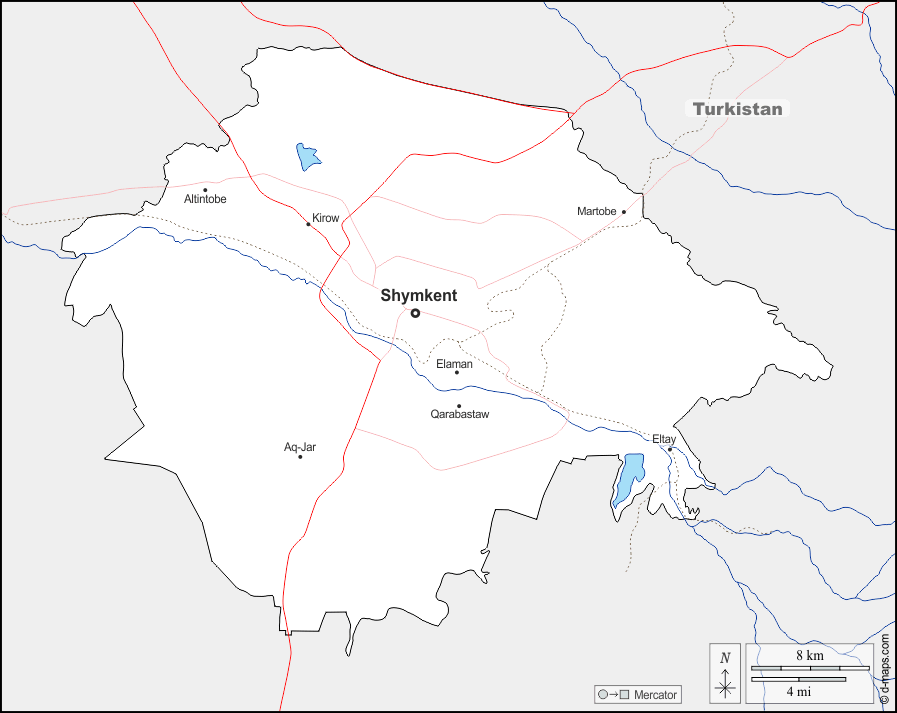 d-maps > Ásia > Cazaquistão > Shymkent > fronteiras, hidrografia, principais cidades, estradas, nomes