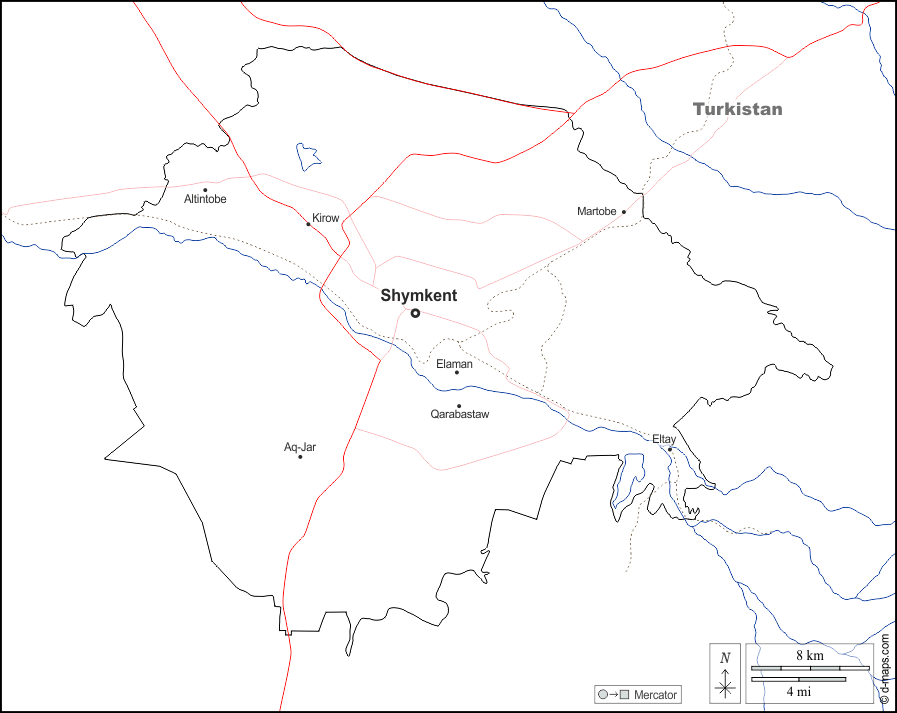 d-maps > Ásia > Cazaquistão > Shymkent > fronteiras, hidrografia, principais cidades, estradas, nomes, branco