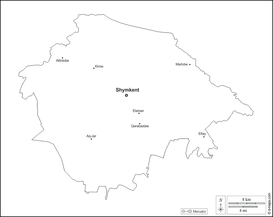 d-maps > Ásia > Cazaquistão > Shymkent > contornos, principais cidades, nomes, branco