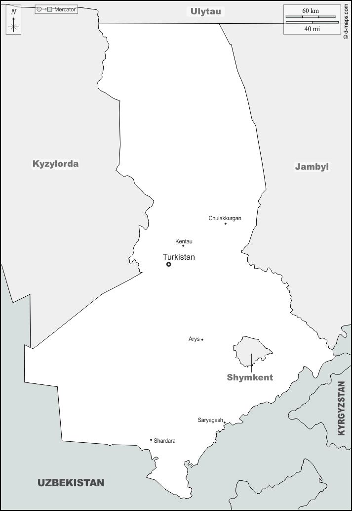 d-maps > Ásia > Cazaquistão > Região do Turquestão > fronteiras, principais cidades, nomes