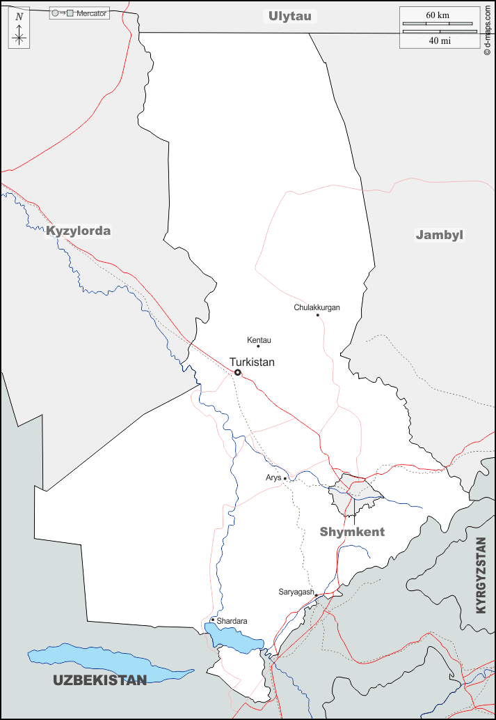d-maps > Ásia > Cazaquistão > Região do Turquestão > fronteiras, hidrografia, principais cidades, estradas, nomes