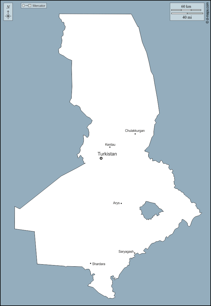 d-maps > Ásia > Cazaquistão > Região do Turquestão > contornos, principais cidades, nomes