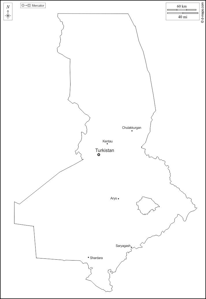 d-maps > Ásia > Cazaquistão > Região do Turquestão > contornos, principais cidades, nomes, branco