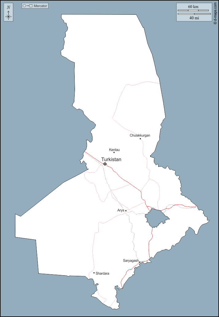 d-maps > Ásia > Cazaquistão > Região do Turquestão > contornos, principais cidades, estradas, nomes