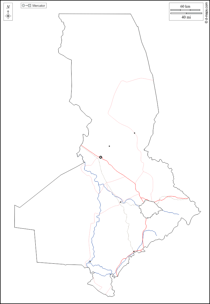 d-maps > Ásia > Cazaquistão > Região do Turquestão > contornos, hidrografia, principais cidades, estradas, branco
