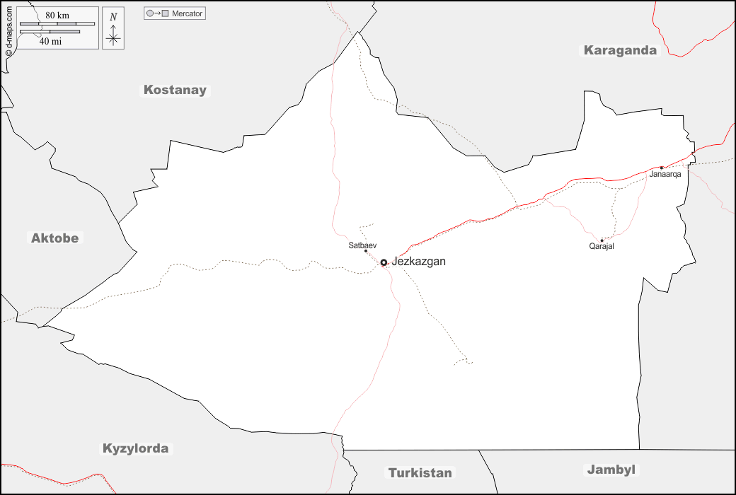 d-maps > Ásia > Cazaquistão > Região de Ulytau > fronteiras, principais cidades, estradas, nomes