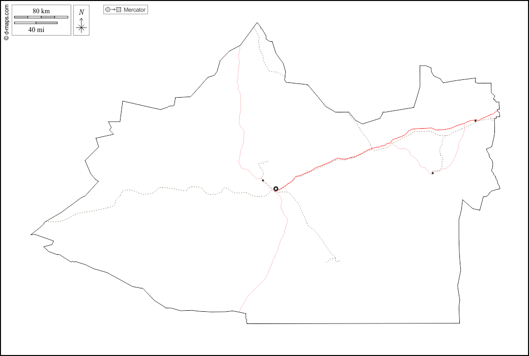 d-maps > Ásia > Cazaquistão > Região de Ulytau > contornos, principais cidades, estradas, branco