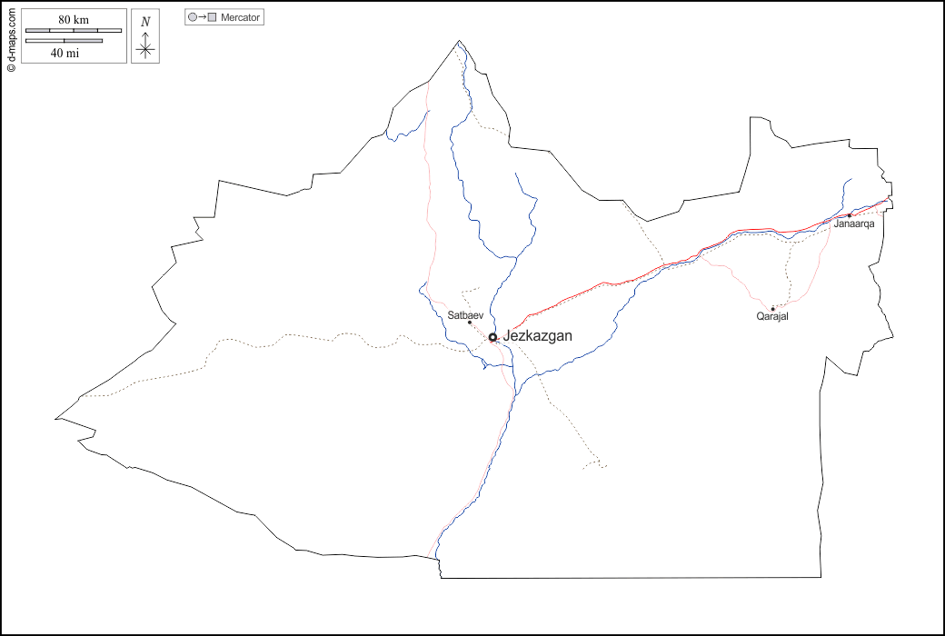d-maps > Ásia > Cazaquistão > Região de Ulytau > contornos, hidrografia, principais cidades, estradas, nomes, branco