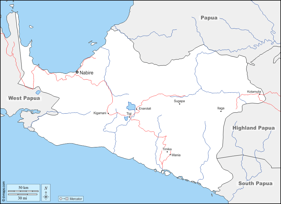 d-maps > Ásia > Indonésia > Papua Central > fronteiras, hidrografia, principais cidades, estradas, nomes