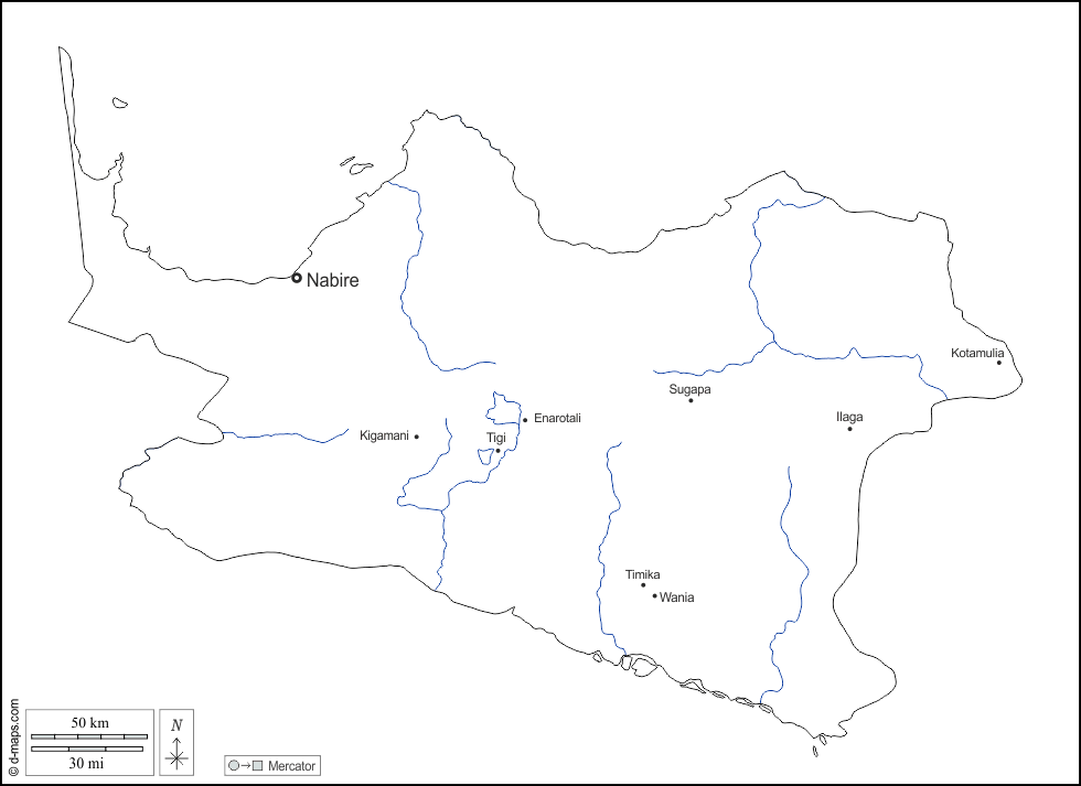 d-maps > Ásia > Indonésia > Papua Central > contornos, hidrografia, principais cidades, nomes, branco