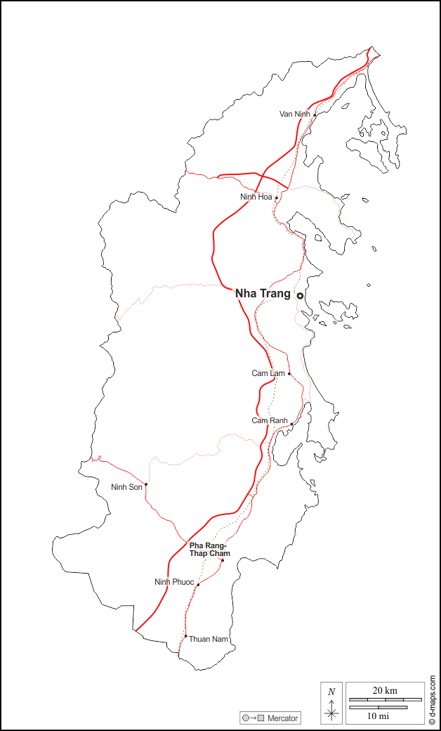 d-maps > Ásia > Vietnã > Província de Khanh Hoa > contornos, principais cidades, estradas, nomes, branco