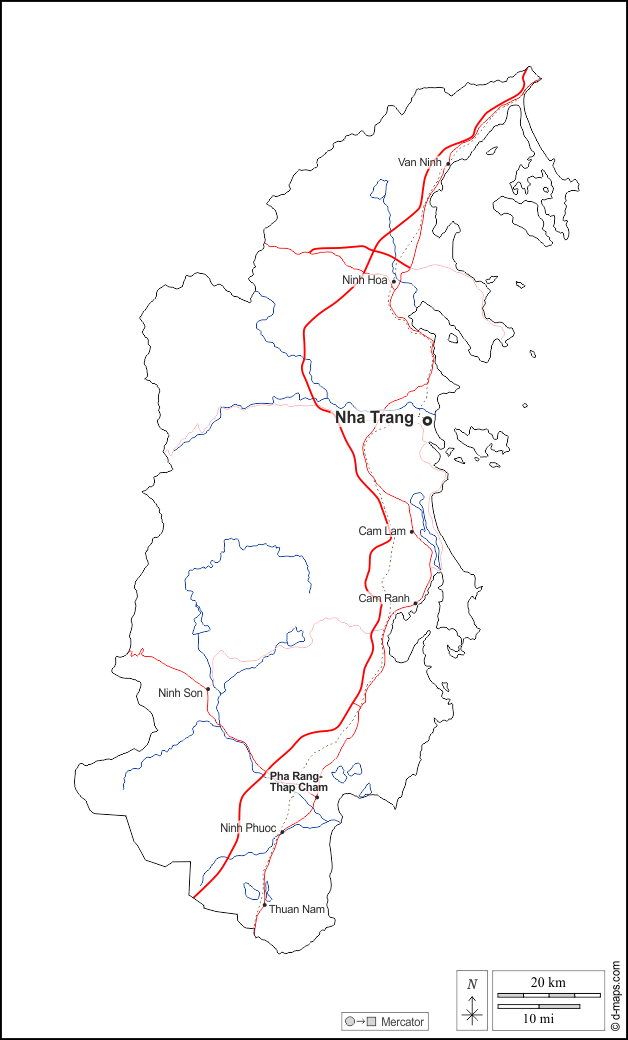 d-maps > Ásia > Vietnã > Província de Khanh Hoa > contornos, hidrografia, principais cidades, estradas, nomes, branco