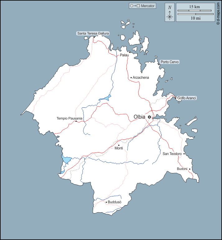 d-maps > Europa > Itália > Província de Gallura, nordeste da Sardenha > contornos, hidrografia, principais cidades, estradas, nomes