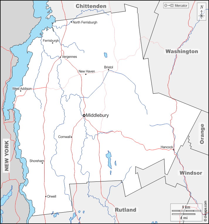 d-maps > Estados Unidos da América (USA) > Vermont > Condado de Addison > fronteiras, hidrografia, principais cidades, estradas, nomes