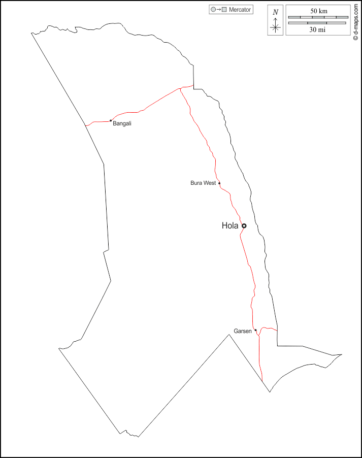 d-maps > Африка > Кения > Округ Тана-Ривер > контур, Главные города, дорог, имена, Белый