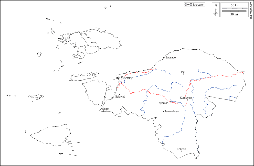 d-maps > Азия > Индонезия > Юго-Западное Папуа > контур, гидрографии, Главные города, дорог, имена, Белый